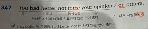 영어 문법 입니다. 347번 문장 끝부분에 on others라는 표현이 있는데 -에게라는 표현을 쓸
